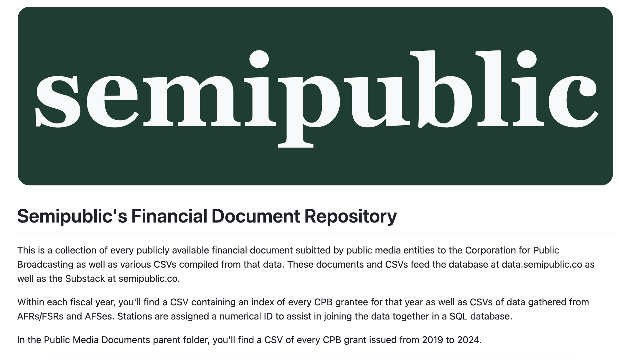 When I launched Semipublic on April 24th, my main goal was to compile public media’s publicly-available financial documentation, as required by the Corporation for Public Broadcasting, and use insights from the data gathered to tell a story about the industry’s future. And I did: Over hundreds of hours, I visited every website of every single CPB grantee to collect their AFRs, FSRs, and AFSes from FY23 - around 1,000 documents in all - and manually input them into a database. Later, I made those documents openly available via a public Github repository.