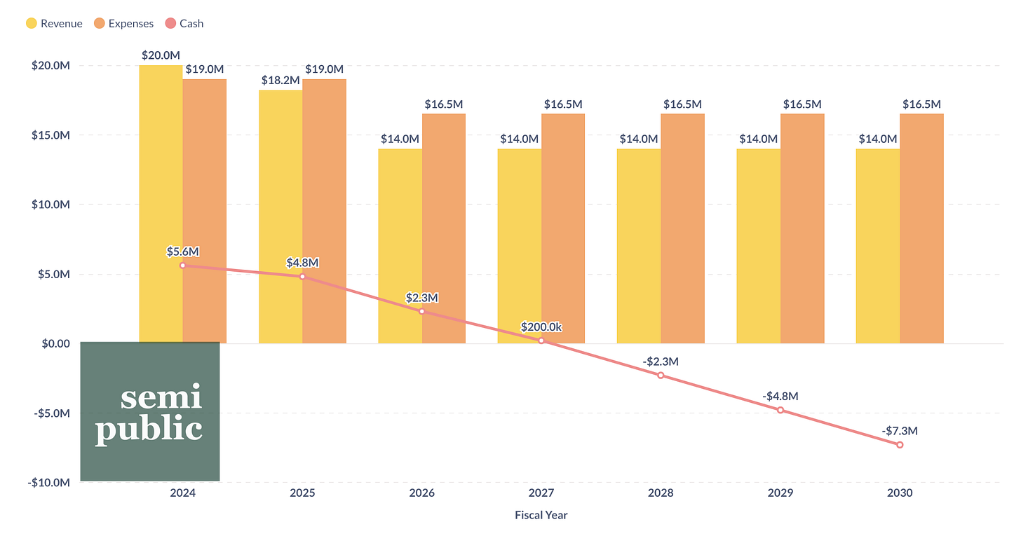 Let’s pretend that AETN’s relative revenues and expenses will stay the same over the next five fiscal years, or until FY30. From an FY24 revenue of $20 million, the network is automatically losing $2.6 million from CPB grants beginning this current fiscal year, FY26. We will also assume that Department of Education grants were not extended during FY25 - either due to grant freezes or the end of CARES/ARPA distributions in Arkansas - subtracting another $3.3 million in revenue from FY25 onward.