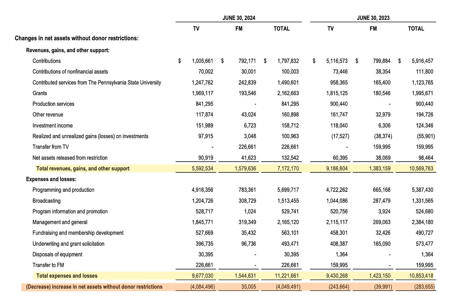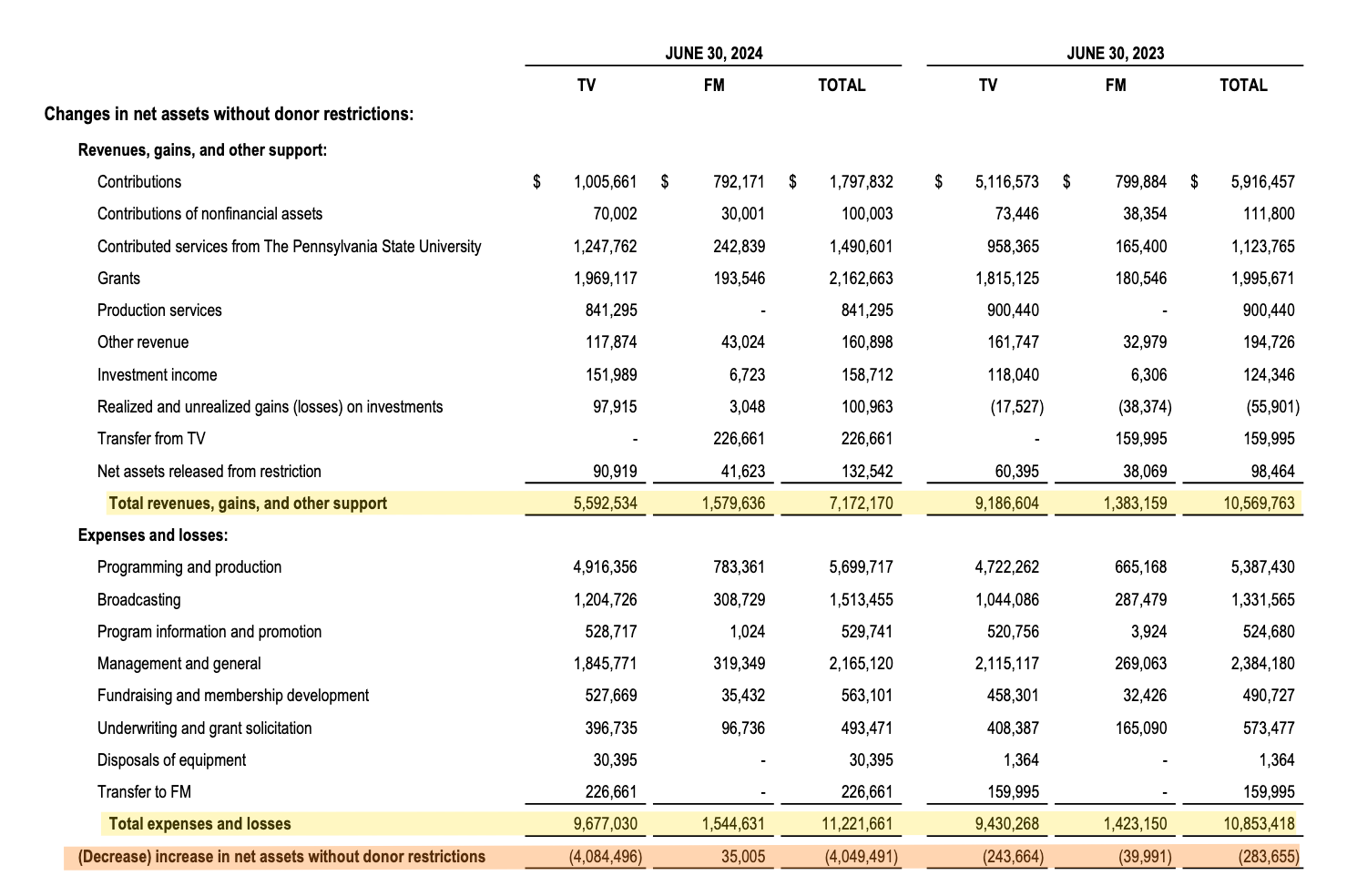 WPSU’s combined yearly financial audit can be found here. For this analysis, we are focused on page 24, the revenues and expenses broken down by TV and radio.