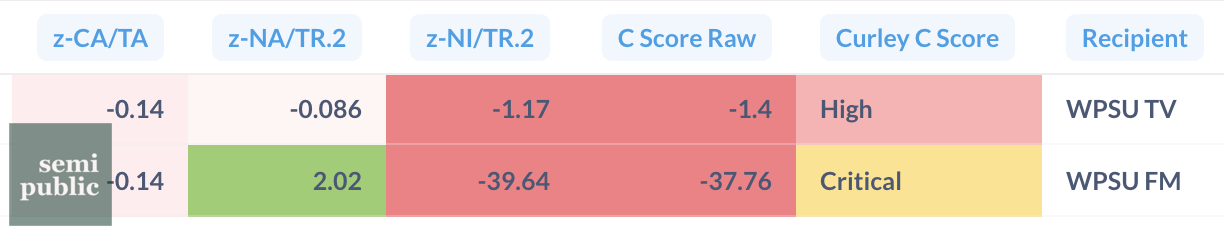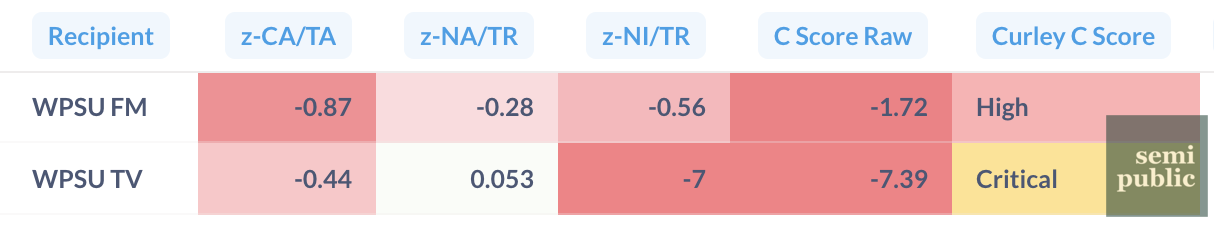 When the Curley C Score is applied to FY24 finances with CPB funding subtracted, WPSU FM and TV flip: The former now has a “high” financial distress score while the latter has a “critical” financial distress score. Again, it’s the very low net income compared to the rest of public media that drags both entities into financial distress, but now so does the relatively low amount of current assets, or assets that can be converted into cash within 12 months.