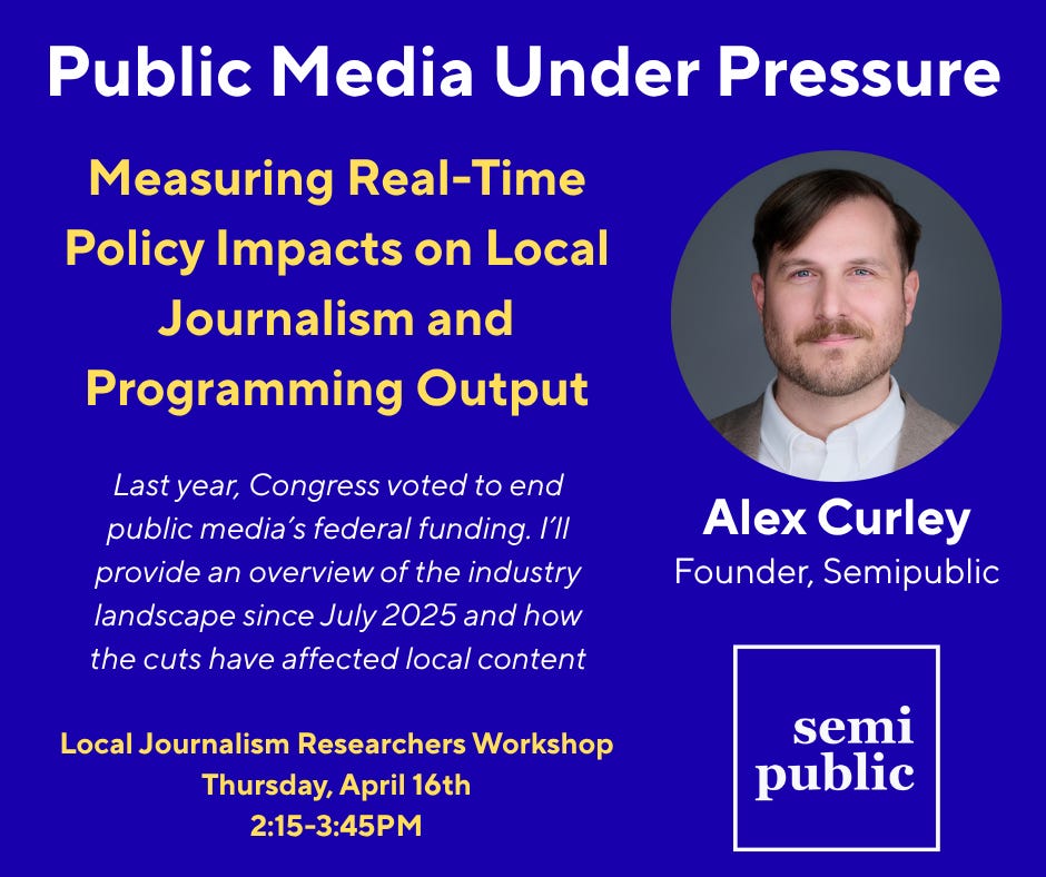 Finally, I was lucky enough to present at the Local Journalism Researchers Workshop in Washington, DC last week. It was incredibly meaningful because not only did Semipublic get to present its research (as a nonprofit!) to a crowd of peers, but I also met researchers that cited our work in their own presentations. It’s an incredible feeling to see our research being reexamined and reused, even after all of these months.