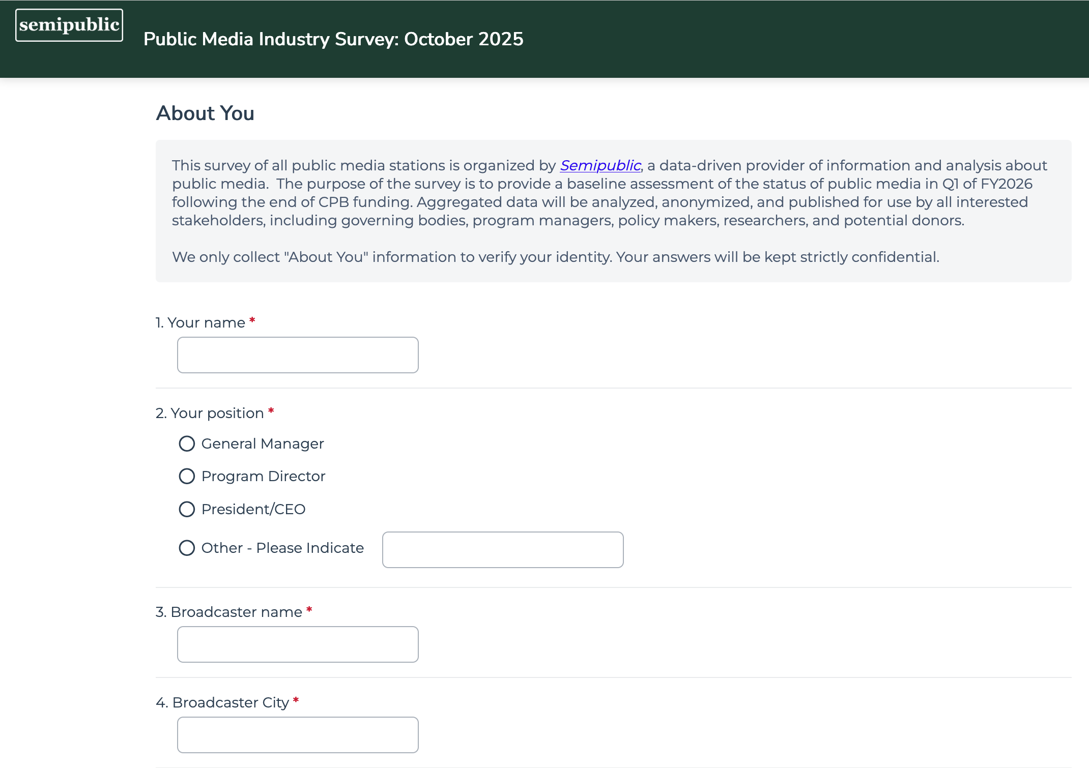 So, if you’re a public media leader, we need your help: Please fill out this survey about how your station is responding to the end of federal funding by Thanksgiving.