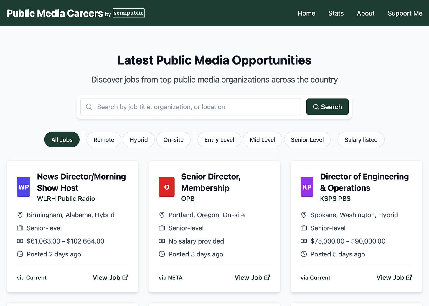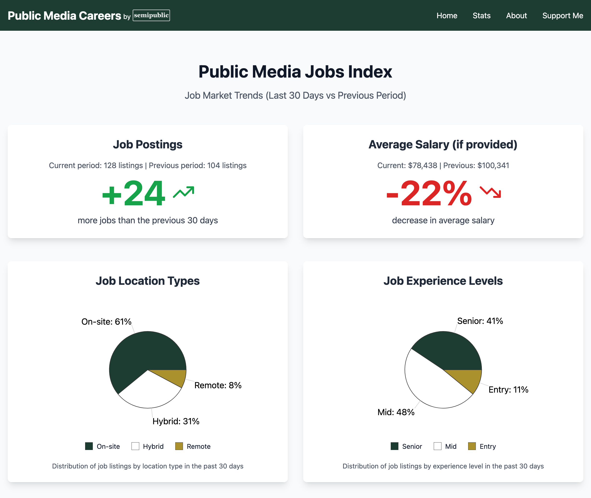 Included in Public Media Careers is a brand-new version of Semipublic’s Public Media Jobs Index. Instead of waiting for each month-end, jobs.semipublic.co/stats contains a rolling comparison of the number of job postings, salary average, location types, and experience levels of listings from the past 30 days compared to the previous 30 days.