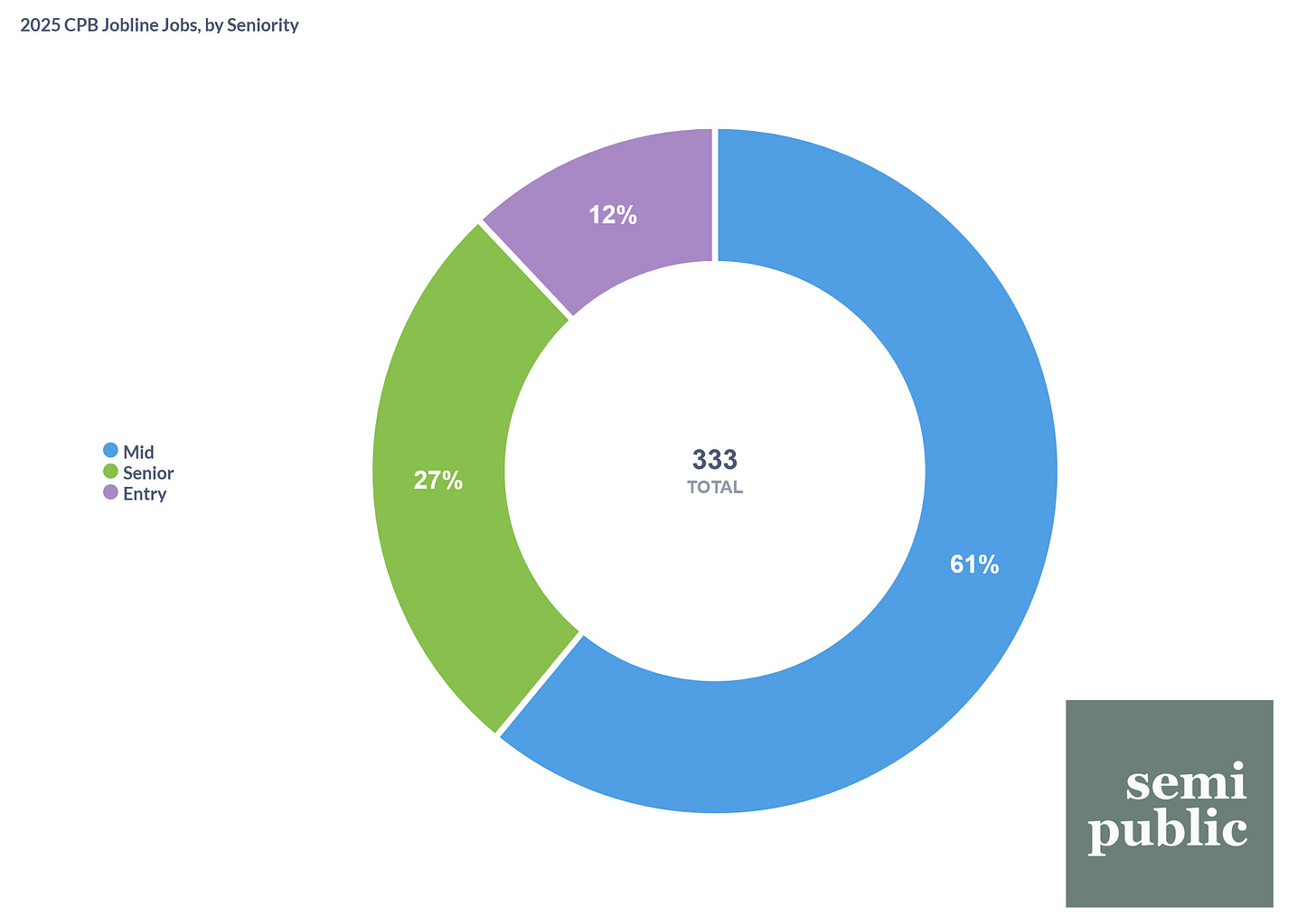 Of those 333 jobs posted so far in 2025, nearly 2/3rds were what I consider to be mid-level jobs, which includes titles like hosts, reporters, and membership managers. On the opposite end, there were only 40 job listings across all stations that were either internships, fellowships, or what I consider to be early-career, meaning that they require little to no professional experience.