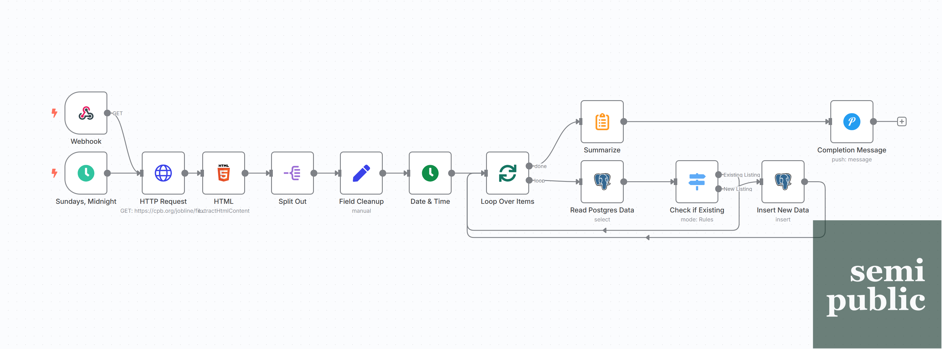 Here’s how it works: A self-hosted instance of changedetection.io running on the Semipublic server stack looks for changes to the Jobline webpage where jobs are listed in order of newest postings. When a change is detected (a listing is added or removed), changedetection.io sends a webhook to a self-hosted instance of n8n on the same stack. The webhook triggers n8n to fetch the HTML of the CPB Jobline website, then extracts job listing data into an array based on CSS selectors. n8n then converts the array into a table, cleans up the data (removes URLs from job titles, separates cities from states, etc, using regex filters), and converts the posted date to ISO 8601. Then, one by one, n8n will match the job listing against existing entries in a PostgreSQL database, inserting new entries and skipping existing ones. Then, a completion message is sent via Pushover to my phone.