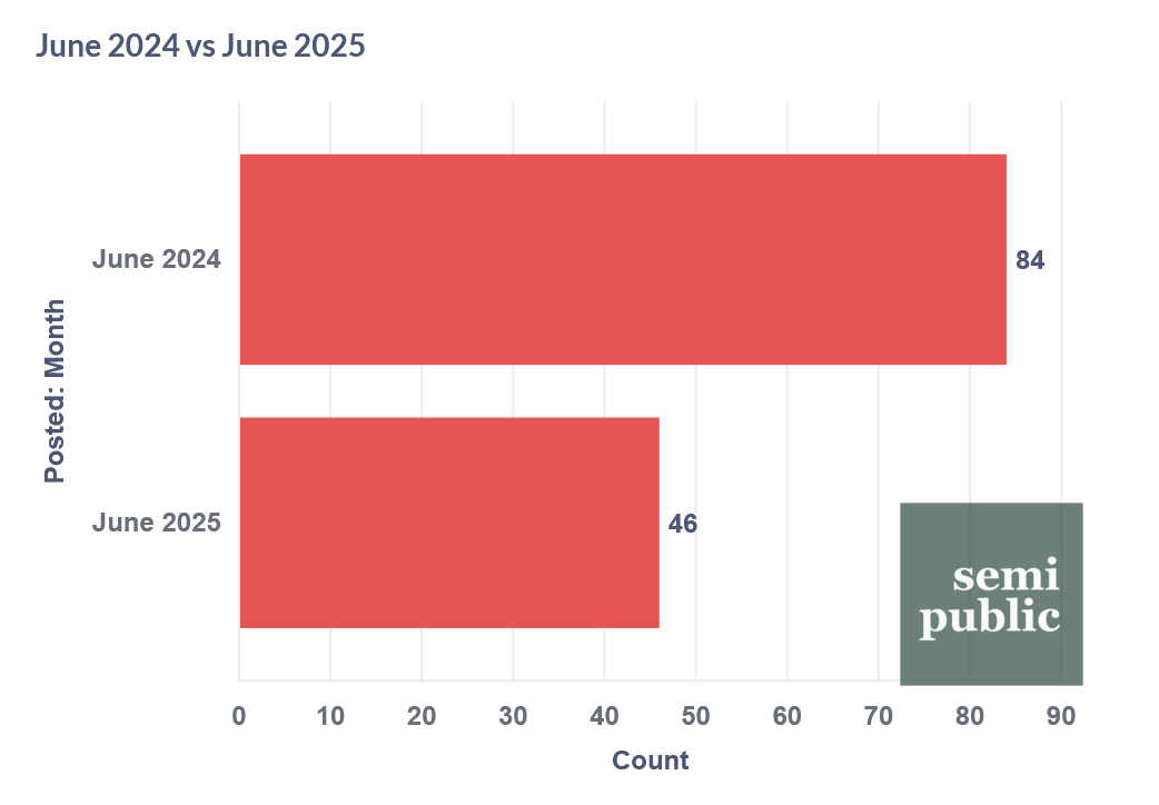 Let’s turn our attention back to 2024. If we compare total job listings between January and June of that year with the same period in 2025, we see a remarkable difference of 104 jobs, or a 24% drop. That drop seemed to start in November of 2024, when job listings plummeted to just 36 that month and 26 in December.