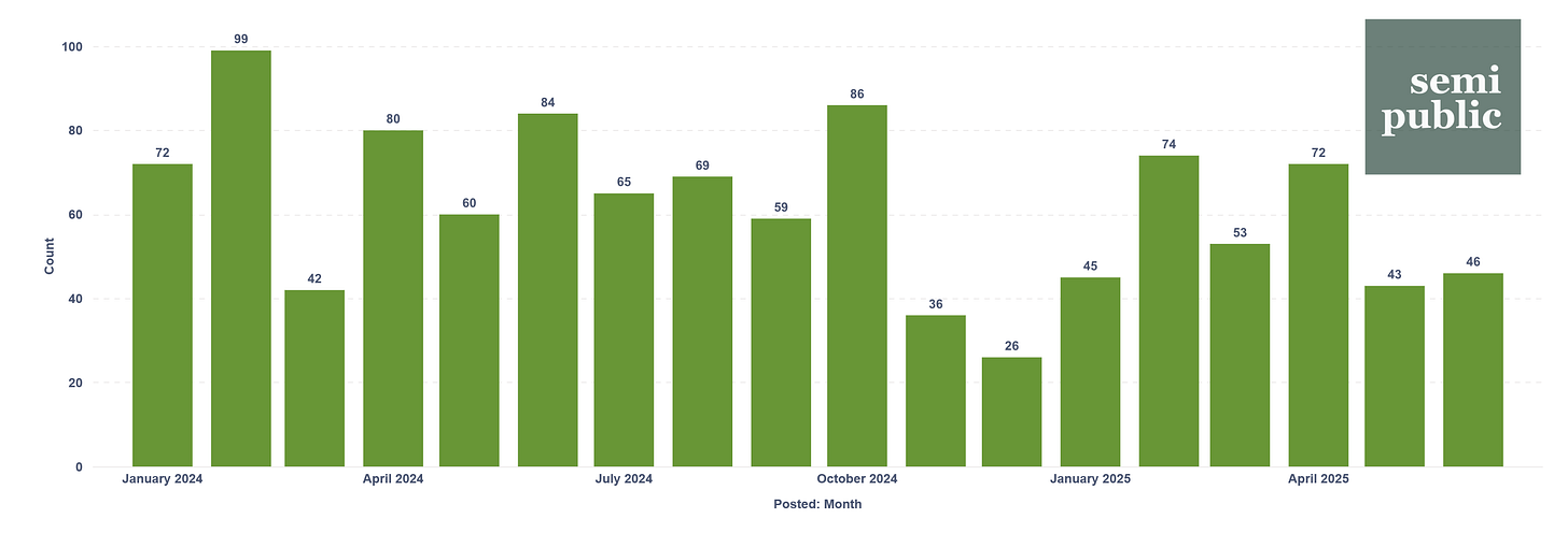 Certainly, two years of data isn’t enough to identify a trend, but can we attribute this year-over-year drop in job listings to the current public media federal funding threat? We see a large drop-off after the election, but that could be normal post-election calm. Both February and April of 2025 had hiring upticks, but none of those peaks and valleys have risen to their 2024 levels.