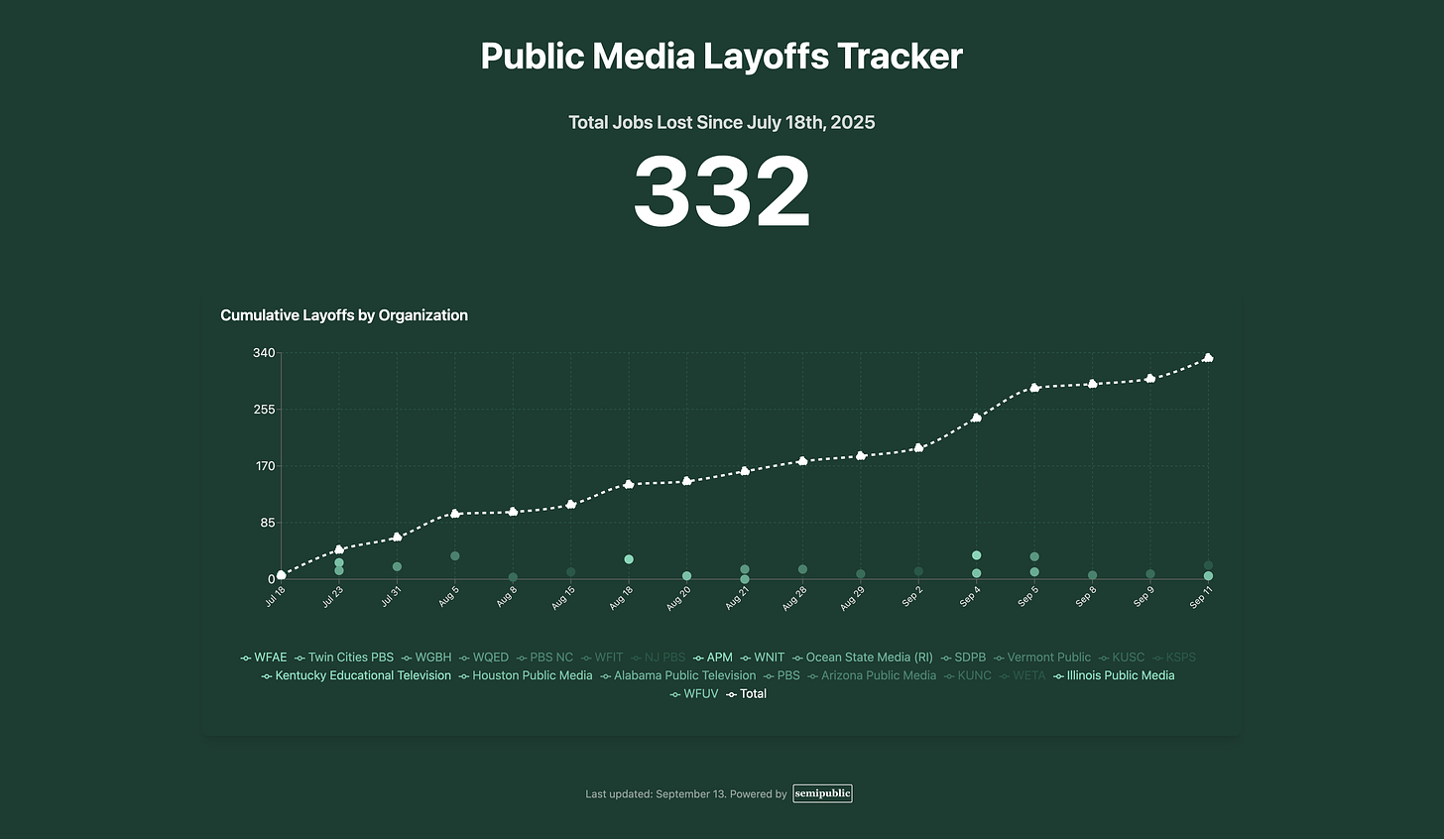 But from a human perspective, every job lost is another person entering a difficult and uncertain job market. So, to honor the human cost of public media’s transformation, I created the Semipublic Public Media Layoffs Tracker.
