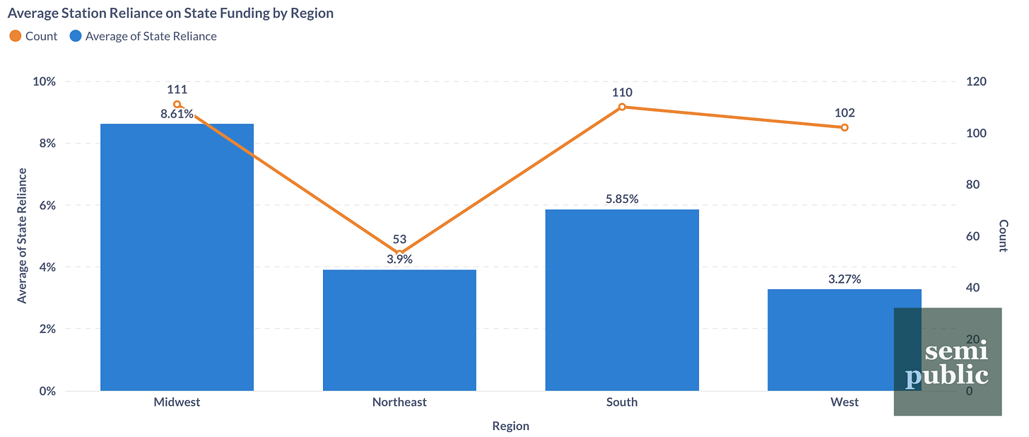 I found it interesting that the South, on average, turned out to be the second-most reliant region: Obviously, Midwestern states fund their public media stations much more as a percentage of station revenue, but 7 of the 16 Southern states had an average station reliance on federal funding that was higher than the national average. Not only that, but the region, in my dataset, very nearly has the same amount of public media stations as the Midwest. Compare that to the 2011 study conducted by NPR, which found that stations in the South would be more vulnerable to federal funding cuts than stations in other regions. As I’ve discussed before, stations in that region must have heeded the warning, because in FY23, the South turned out to be less reliant on average than other regions - perhaps those stations managed to trade federal funding for state funding instead.