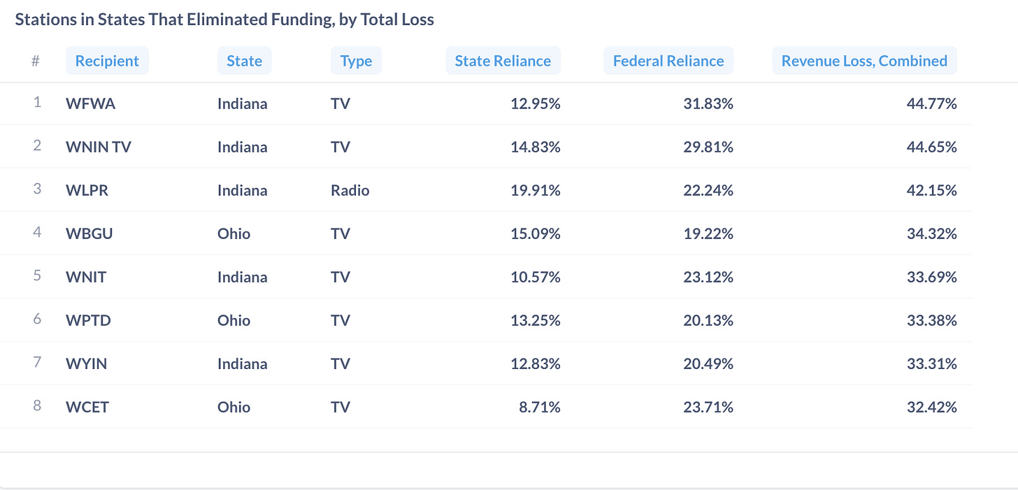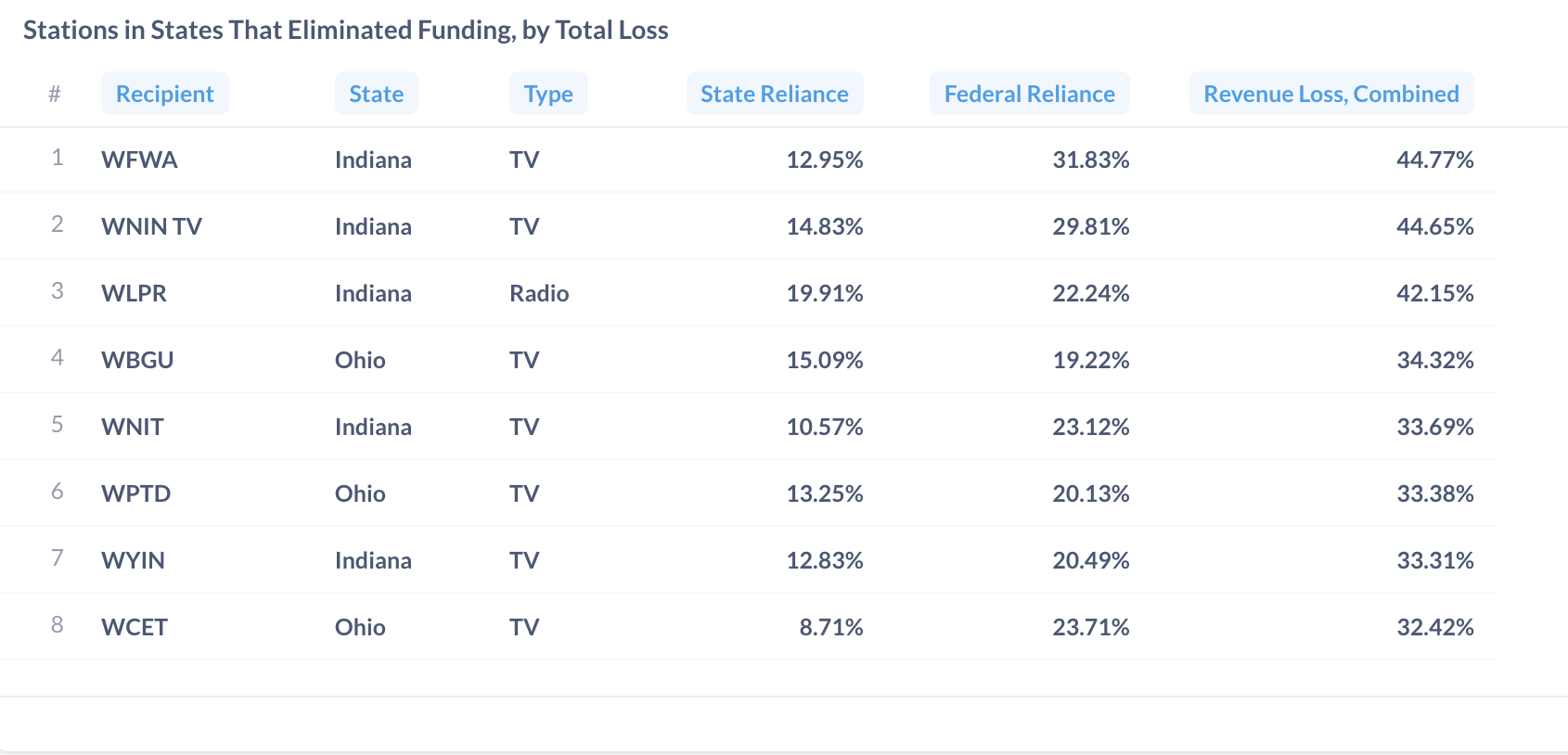 Among the two states that have completely eliminated funding for public media, stations in Indiana have been hit the hardest, losing a combined average of 24% of their total revenue. Ohio stations, on the other hand, are losing an average of 17%.