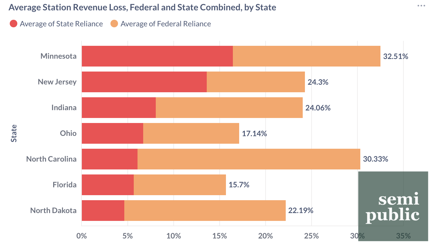 Additionally, stations in Minnesota and North Carolina far and away have the highest average reliance on both federal and state funding, with the former having the highest state funding reliance of any of the affected states, and the latter having the highest reliance on federal funding. These two states have not completely cut public media spending, but an accounting of their total reliance on both that and federal funding shows just how vulnerable those stations are.