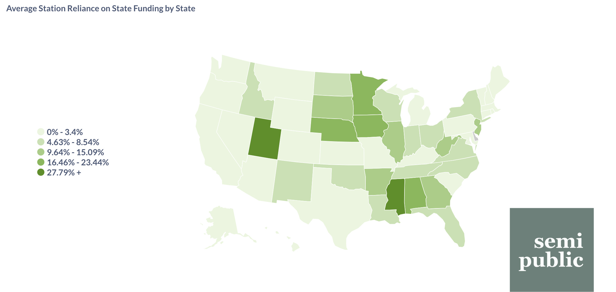 Another interesting finding is that stations that are not affiliated with either NPR or PBS - mostly music stations - only had a slightly higher reliance on state funding on average than NPR-affiliated stations, or even all public radio stations. In my breakdown of average federal funding reliance, I found that these stations were more dependent on that funding than other stations. That doesn’t necessarily seem to be the case with state funding.