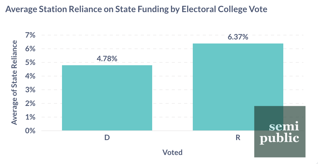 One finding that did not differ from my look at federal funding was average station reliance on state funding broken down by how the state voted in the 2024 Electoral College. As it turns out, public media stations in states that voted for Biden, on average, rely on state funding two points less than states that voted for Trump, with Mississippi (33%), Utah (28%), and Alabama (23%) leading the way.