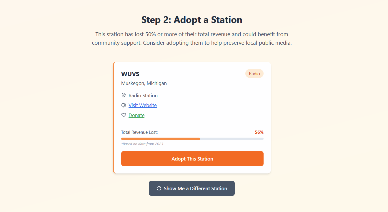But it’s undeniable that the months of data work I’ve put into Semipublic all informed the design of Adopt A Station: I already had a database of every CPB grantee and their reliance on federal funding, so adding that data and station details to the new website was just a matter of copying and pasting; I also, in my work estimating financial distress in public media stations after factoring in the loss of federal funding, calculated that all stations losing 50% or more of their total revenue were at a critical risk of closing in the near future, which became the threshold for listing stations in the “adopt” section.