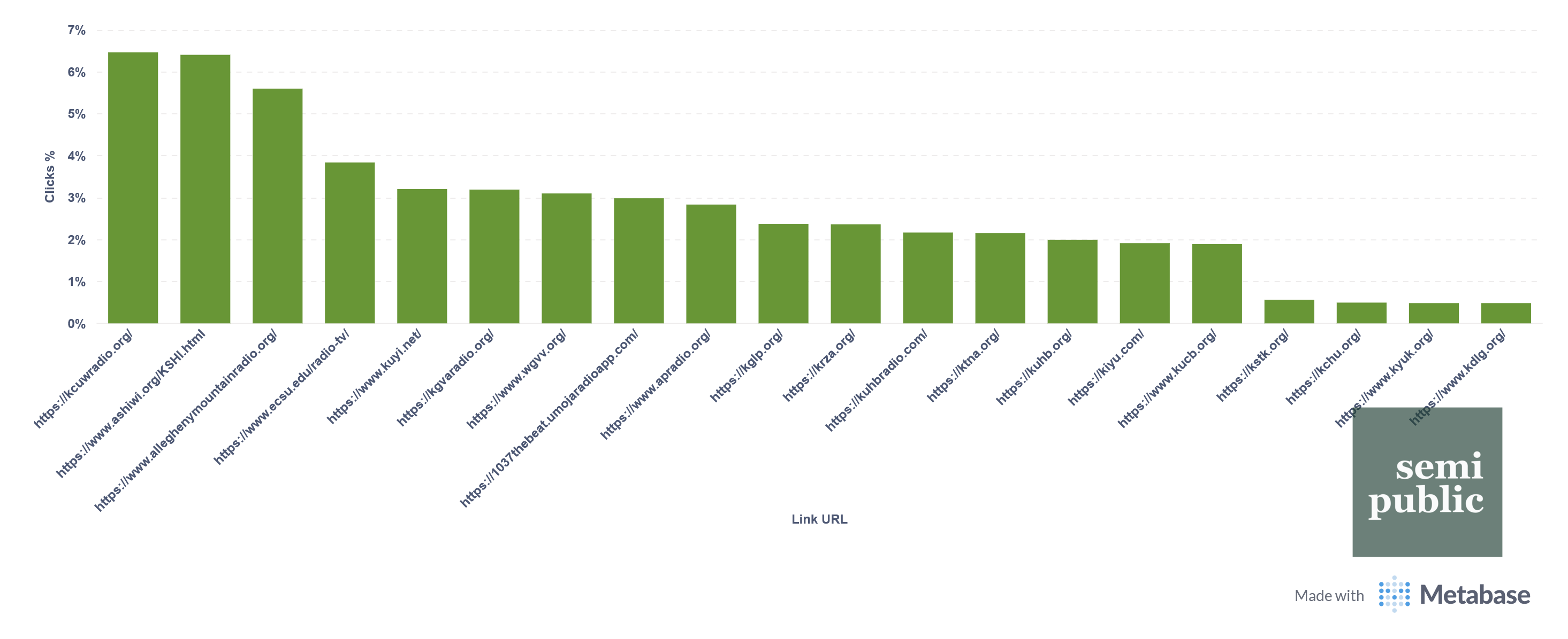 More than 20,000 people have visited the site since it launched on the morning of Sunday, July 20th. Of those visitors, 39% clicked on the website of any public media station - which I’ll refer to as outbound clicks. Just a few days earlier, that number was nearly 50%.
