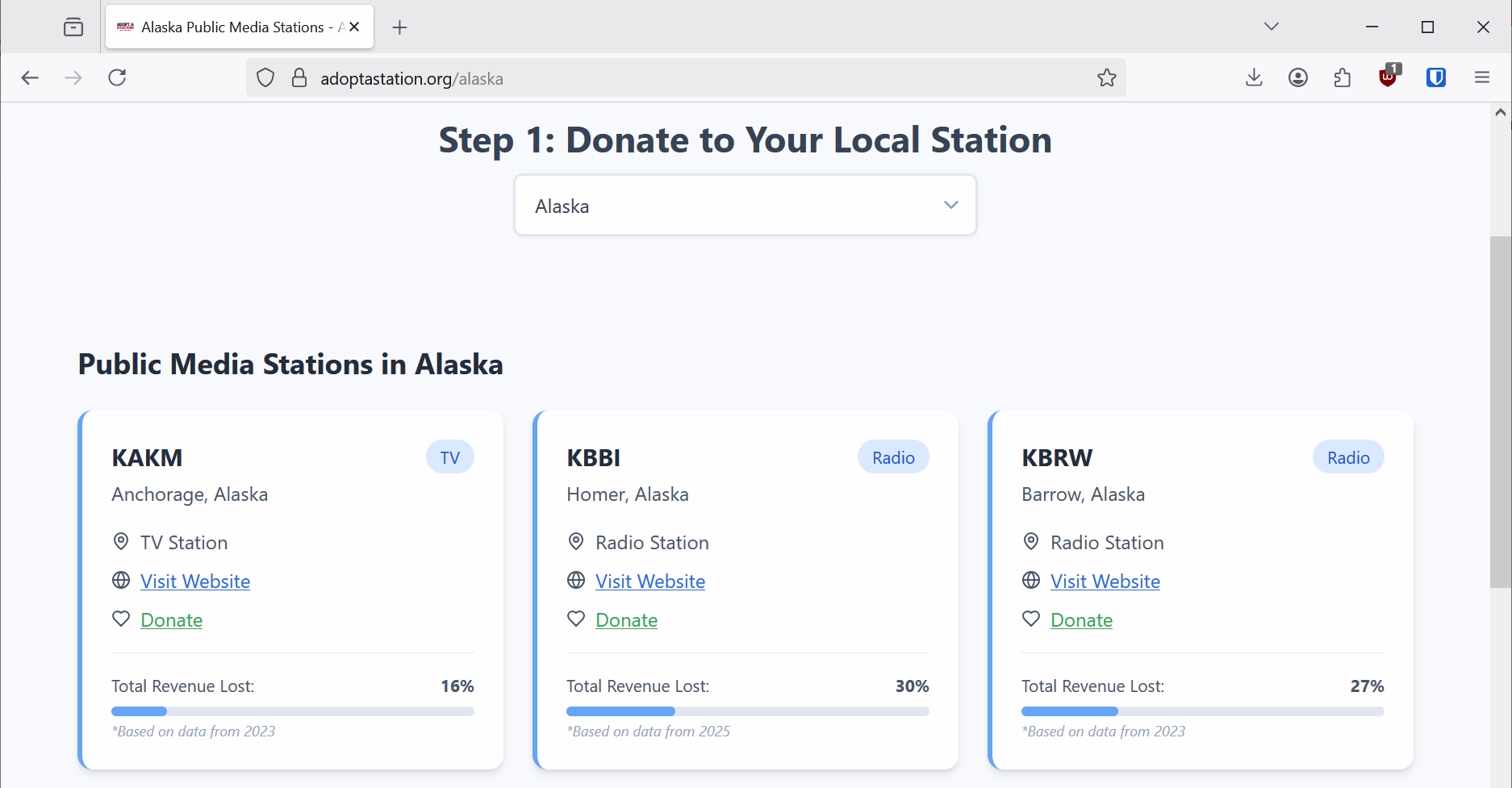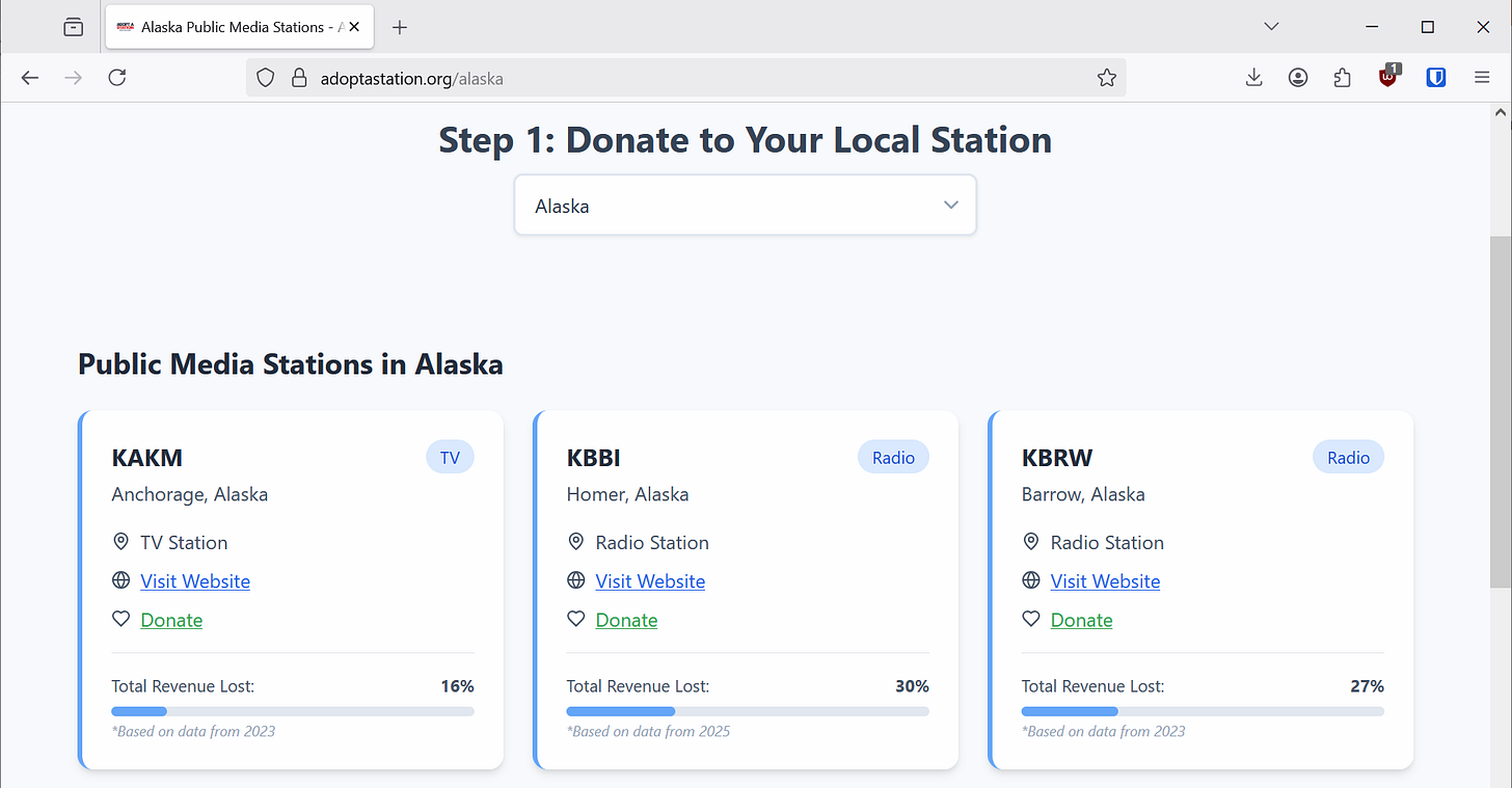 So, when some very generous friends offered to help collect and add the donation portals of each public media station on Adopt A Station, I couldn’t say no. Visitors being able to go to a station’s main site and explore the many unique ways that broadcaster serves their community is also a key part of the site’s success, so I opted to place the link to the station’s donation portal unobtrusively underneath the link to the main site.